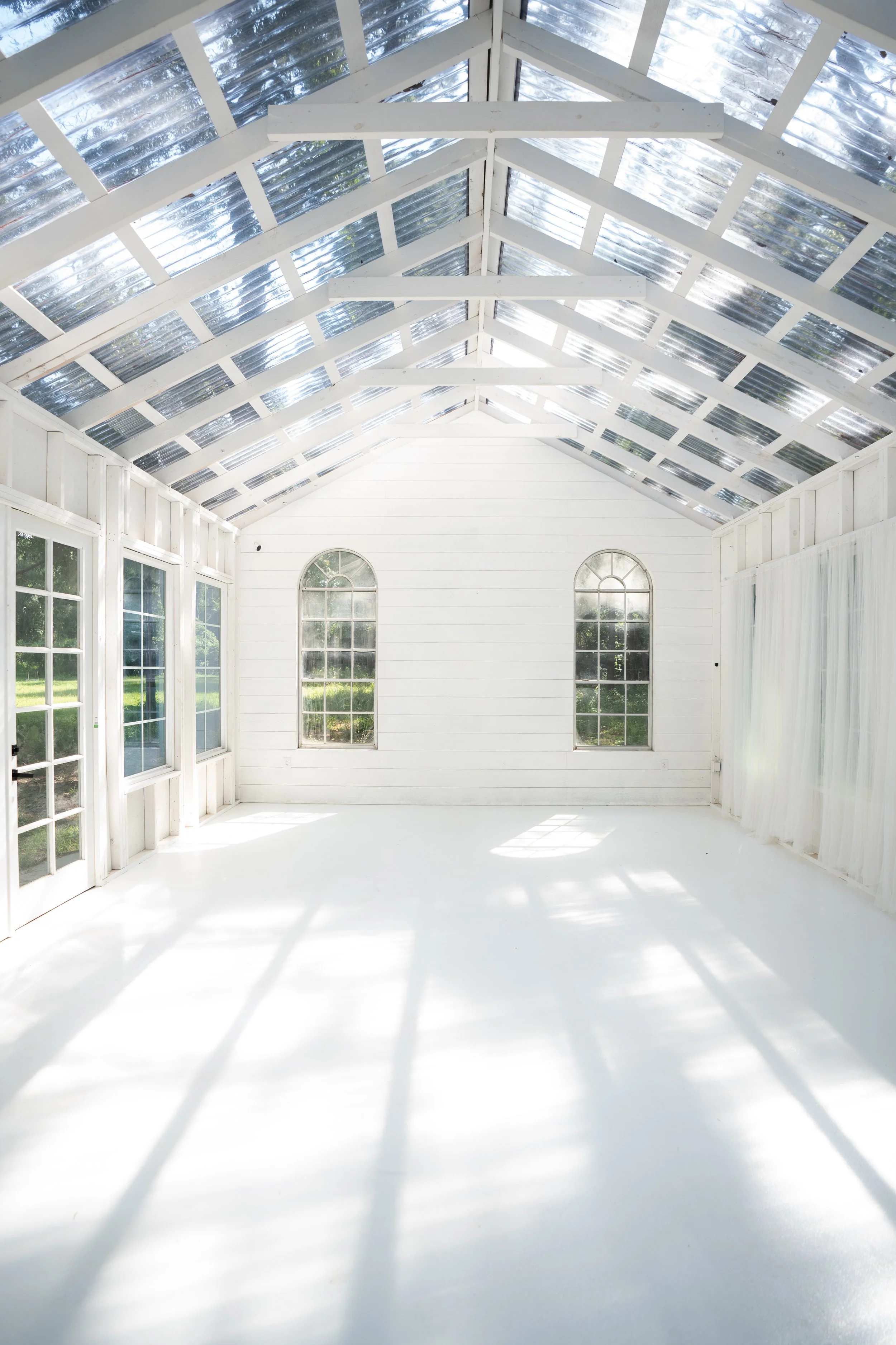 Our all-white greenhouse is a light-filled, seasonal space perfect for photoshoots and intimate gatherings.